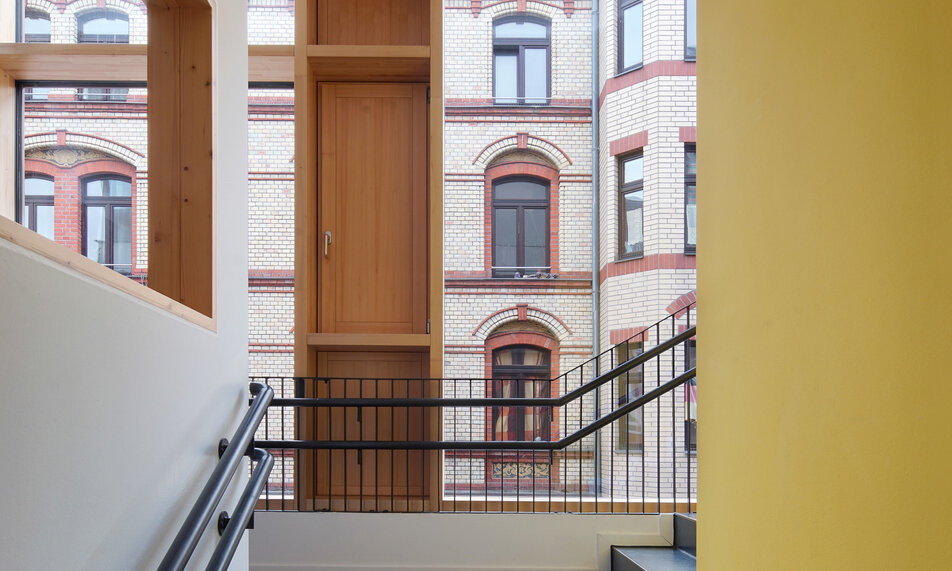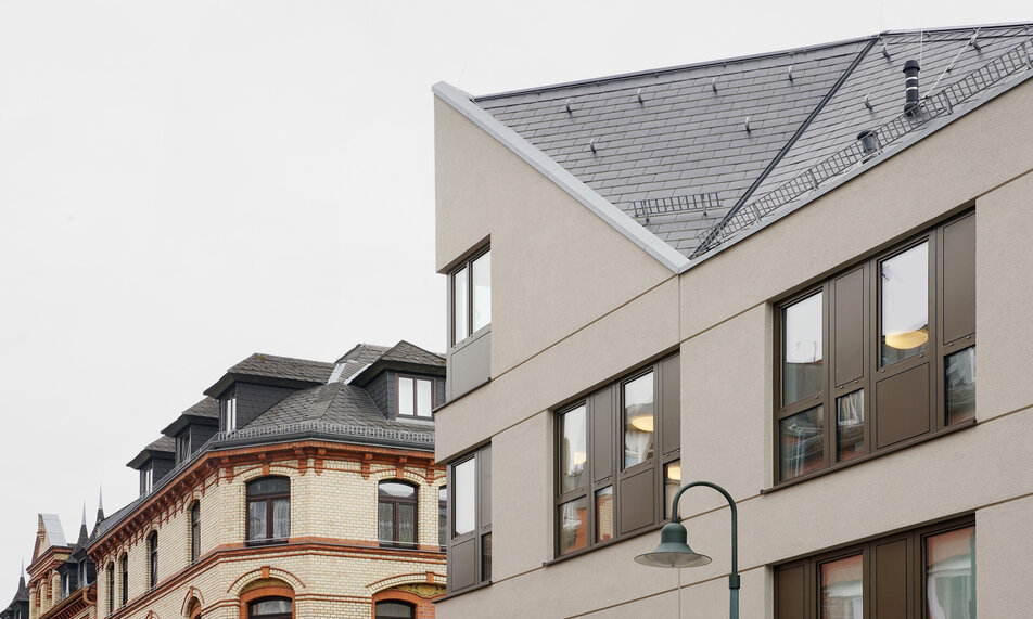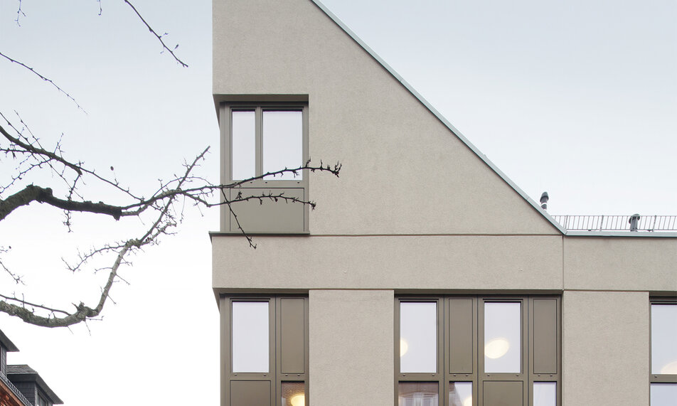 Mit der Schließung einer der letzten Baulücken im dicht bebauten Bergkirchenviertel vervollständigt der Neubau einen historischen Block im Sinne der Sanierungssatzung von 1972 und trägt wesentlich zur Komplettierung des urbanen Stadtbildes bei. Mitten im denkmalgeschützten Ensemble fügt sich der Neubau selbstbewusst in das Stadtbild ein. Ortstypische Merkmale werden übernommen und neu interpretiert. Wegen der knappen Grundstücksfläche entwickelt sich das Raumprogramm außergewöhnlich in die Höhe.