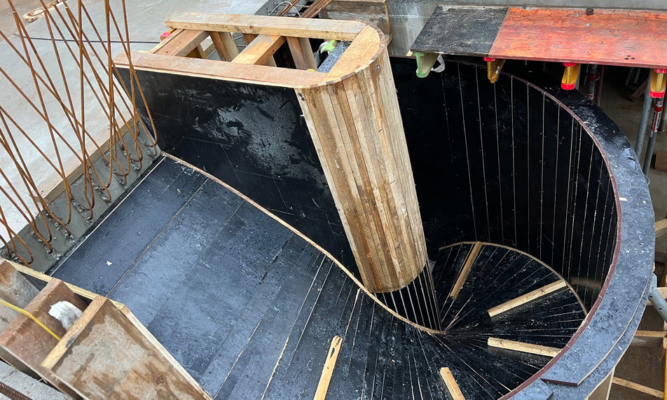 Die Bauarbeiten der Villa R in Gundernhausen schreiten mit der Betonierung der runden Sichtbetontreppe voran.