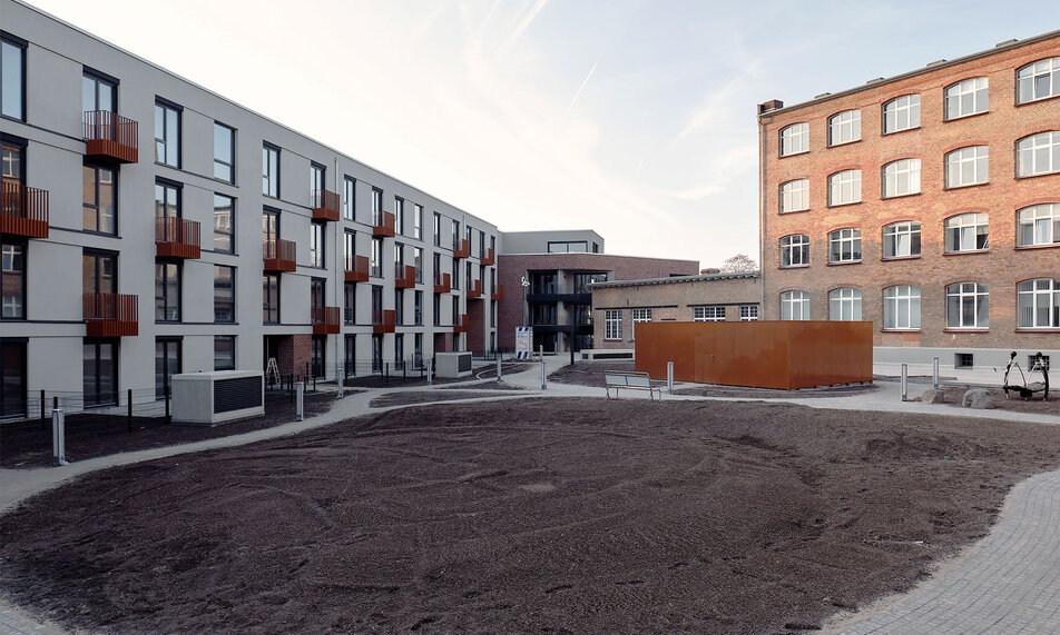 im Bestand. Die vorgefundene Bebauung einer ehemaligen Fabrik wird arrondiert, durch Neu- und Umbauten ergänzt und zu einem Ensemble aus Wohnen und Gewerbe auf einem Grundstück weiterentwickelt. Das von einem begrünten Innenbereich geprägte Wohnumfeld wird für die Bewohner der 68 Wohnungen einen positiven Beitrag zur Qualität des Zusammenlebens und zur Identifikation mit dem Ort leisten.