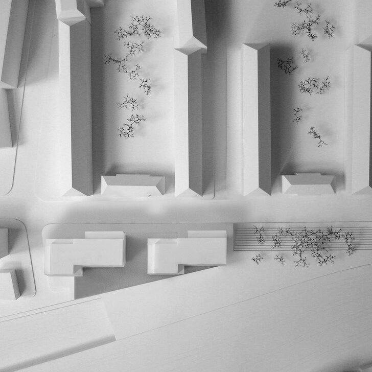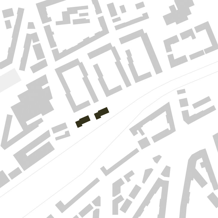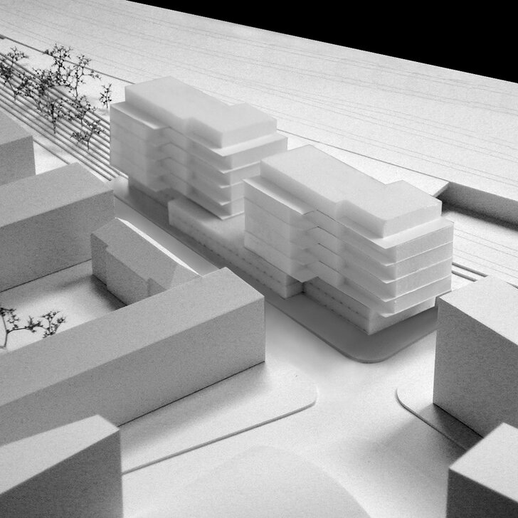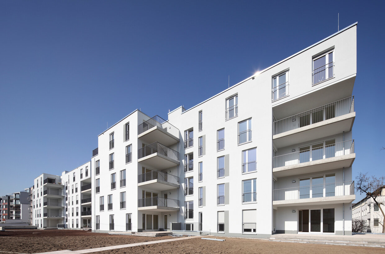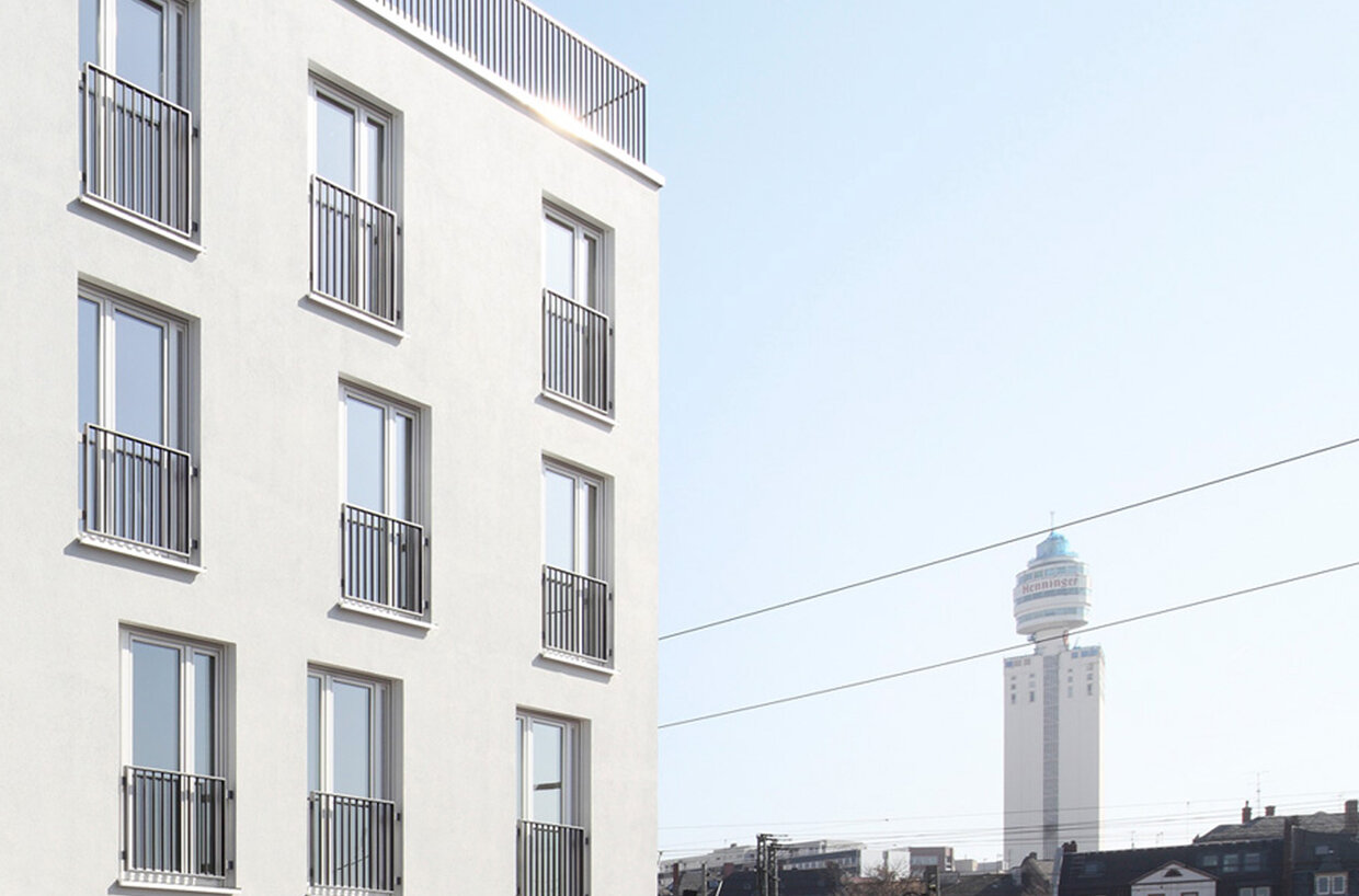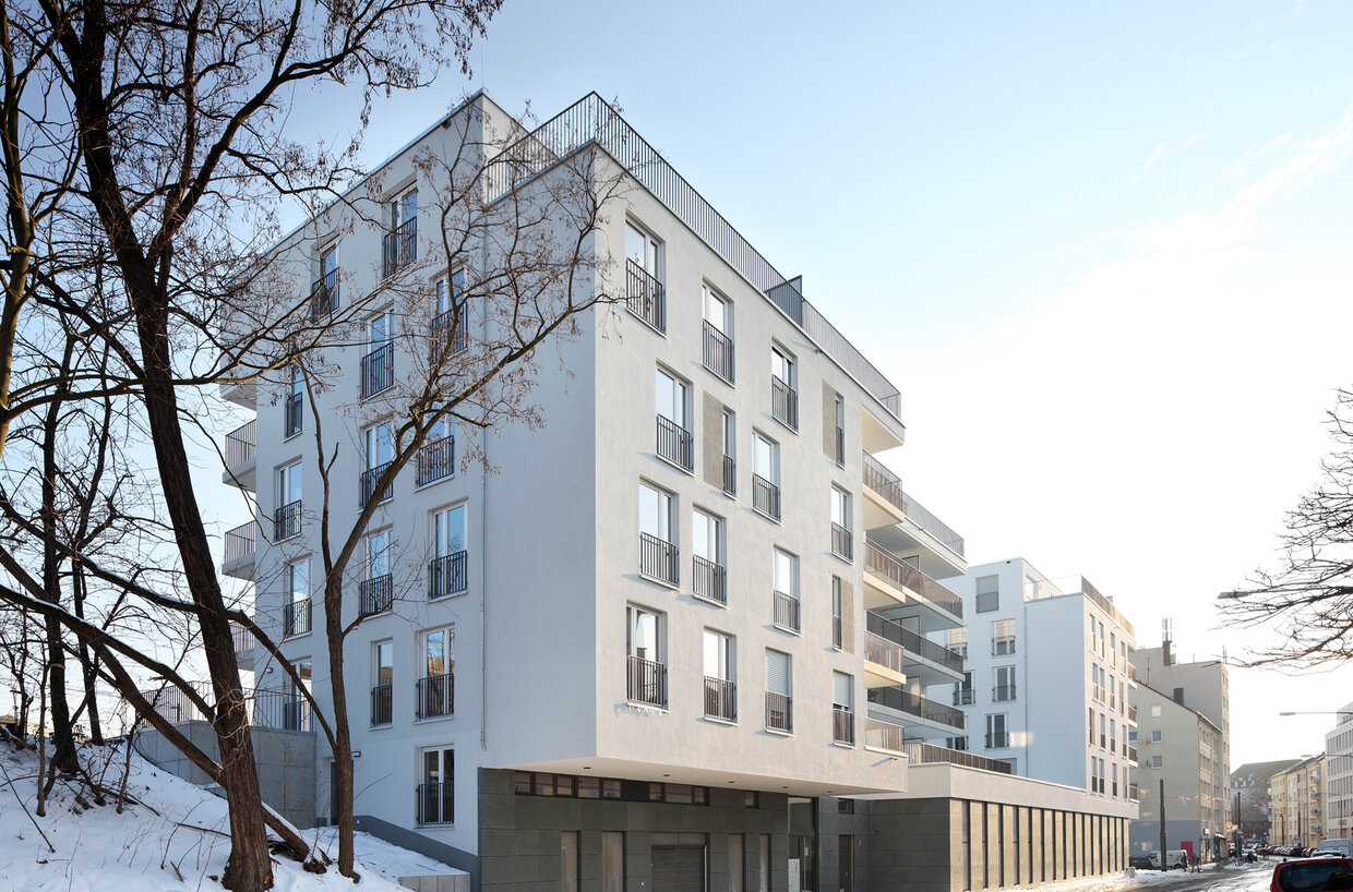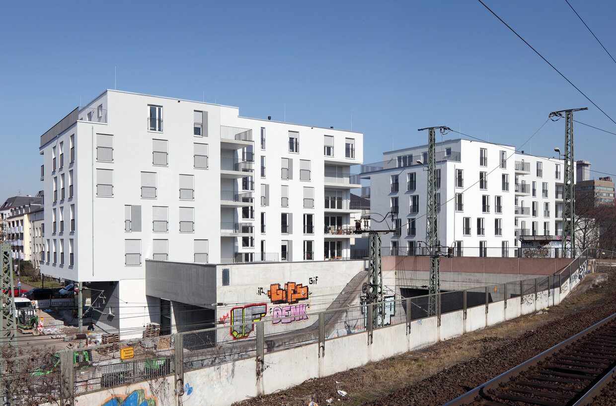 Gerade wegen der schwierigen Rahmenbedingungen – benachbarte Bahntrasse, schmales, dreieckiges Grundstück und Höhenversprung an dessen Grenzen – wählte die Frankfurter Bauaufsicht diese Planung als Leitprojekt im Bereich Wohnungsbau aus. Der Entwurf sieht einen in Anlehnung an die umliegende Bebauung maßstäblich gegliederten Gewerbesockel und zwei darauf aufbauende, fünfstöckige Wohnhäuser vor. Ausgeprägte Rücksprünge des Sockels bilden im Zusammenspiel mit den Auskragungen der Häuser eine räumlich differenzierte Gebäudekante zum öffentlichen Straßenraum aus, wobei durch die versetzte Anordnung und die farbliche Abstufung der Eindruck eines vielfältigen Bebauungsensembles entsteht. Die vierspännig organisierten Wohneinheiten sind über Eck angeordnet und bieten eine hohe Aufenthaltsqualität.