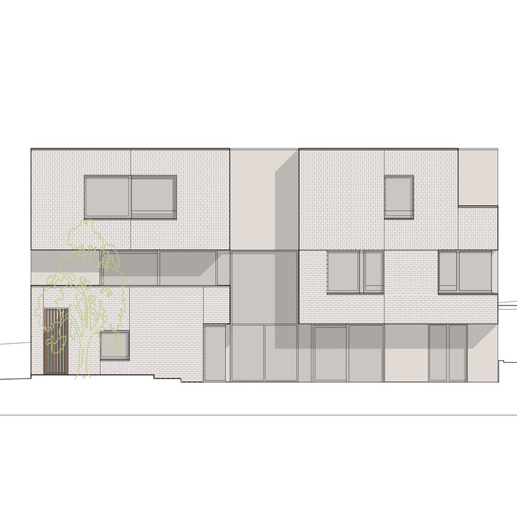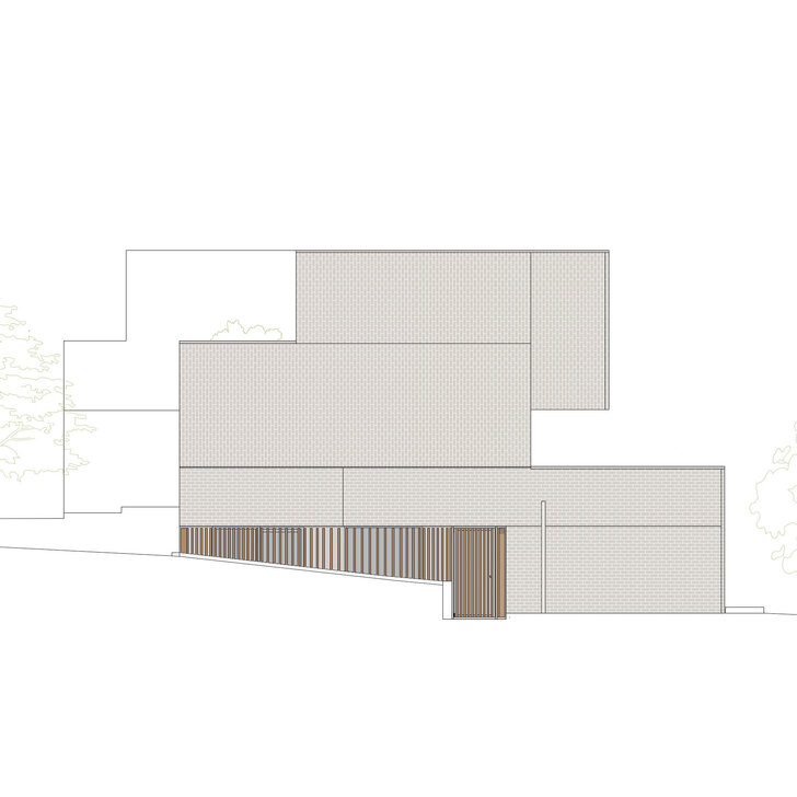 Das komplexe Raumprogramm für eine fünfköpfige Familie ist aufgrund der topographischen Situation auf drei Ebenen organisiert. Die Fassadengestaltung reflektiert die markante Gliederung des Baukörpers und ist von einer klaren Formensprache, einer einheitlichen Farbgebung sowie dem Zusammenspiel der Materialien Klinker, Putz und Holz geprägt. Mit Einsatz von Geothermie und Solarthermie werden Wärme und Strom umweltfreundlich erzeugt.